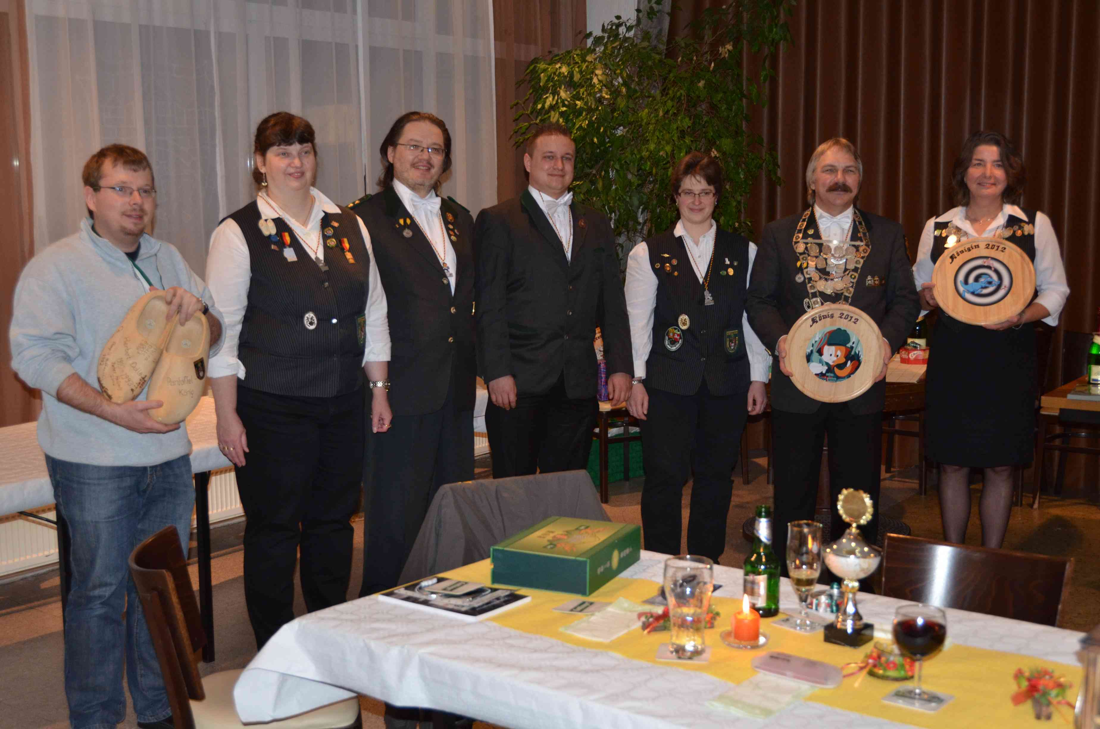 Das Königshaus 2012: Königin Andrea Dolle, König Dieter Schwabe, Kronprinzessin Kerstin Trümper, Kronprinz Steffen Hinz, Prinzessin Bärbel Fraatz, Prinz Thomas M. Rösner , Pantoffelkönig Frank Hilmer, Ehrenscheibe Dieter Schwabe |