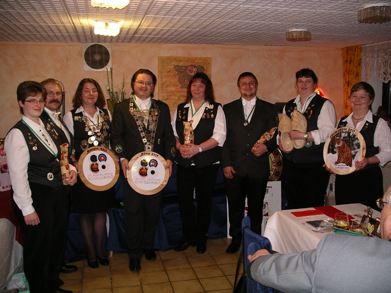 Königshaus 2011: Königin Andrea Dolle, König Thomas M. Rösner, Kronprinzessin Kerstin Trümper, Kronprinz Dieter Schwabe, Prinzessin Nicole Heimgärtner, Prinz Steffen Hinz, Pantoffelkönigin Bärbel Fraatz, Ehrenscheibe Petra Dolle >>Vergrössern<< | Königsfeier 2011 | Königsfeier 2011 | Königsfeier 2011 |